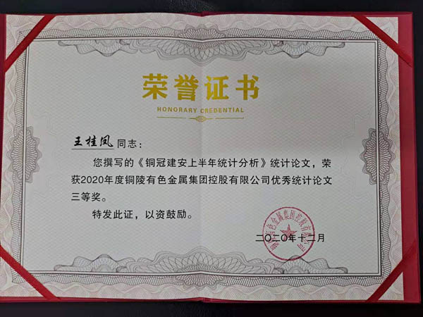 12月29日,在集團公司統計工作會(huì )議上,公司獲“2020年度統計工作先進(jìn)單位”榮譽(yù)稱(chēng)號,公司《銅冠建安上半年統計分析》論文榮獲集團公司優(yōu)秀統計論文三等獎。
